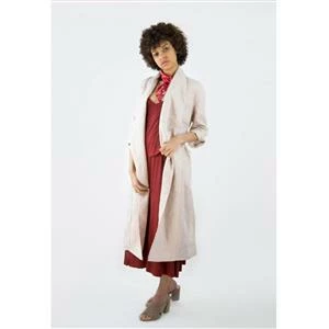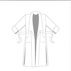 wide draped shawl-style collar. It is a shin length, unlined duster