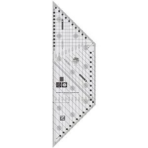 Cuts multiple diamonds up to a finished size of 15.2cm (6″). The ruler enables you to cut various strip widths from 1.3cm (½”) up to 16.5cm (6½”) using the long edge up to 55.9cm (22″) long. There is also a black/white dashed 5.7cm (2 1/4″) line for making bias binding. The ruler cuts all the ‘Base’ and ‘Top’ triangles for setting the diamond with no ‘Y’ seams.
